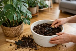 - Brak drenażu. Jeśli donica nie ma warstwy odpływowej z keramzytu ogrodniczego lub naturalnego drenażu 8–16 mm, woda gromadzi się przy korzeniach i powoduje ich gnicie.