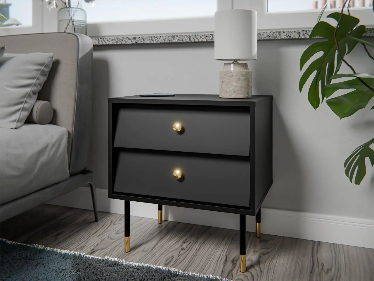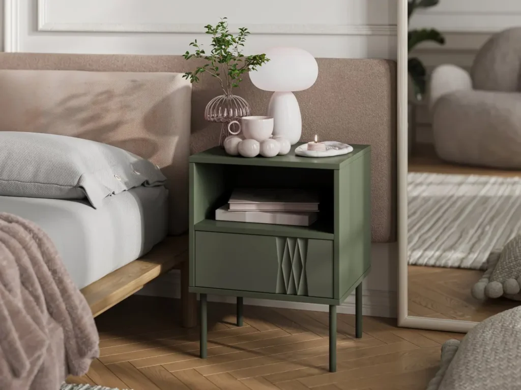 Alternatywą dla modeli montowanych do ściany jest klasyczna szafka nocna na nóżkach. Wysokie, cienkie nóżki odsłaniają fragment podłogi, dzięki czemu mebel nie wygląda ciężko i nie przytłacza wnętrza. Taki model często pasuje do aranżacji skandynawskich, nowoczesnych lub retro, w których liczy się prostota i funkcjonalność. W praktyce oznacza to, że nawet niewielka szafka może pomieścić książkę, lampkę nocną czy szklankę wody, a jednocześnie pozostawić wrażenie przestronności.